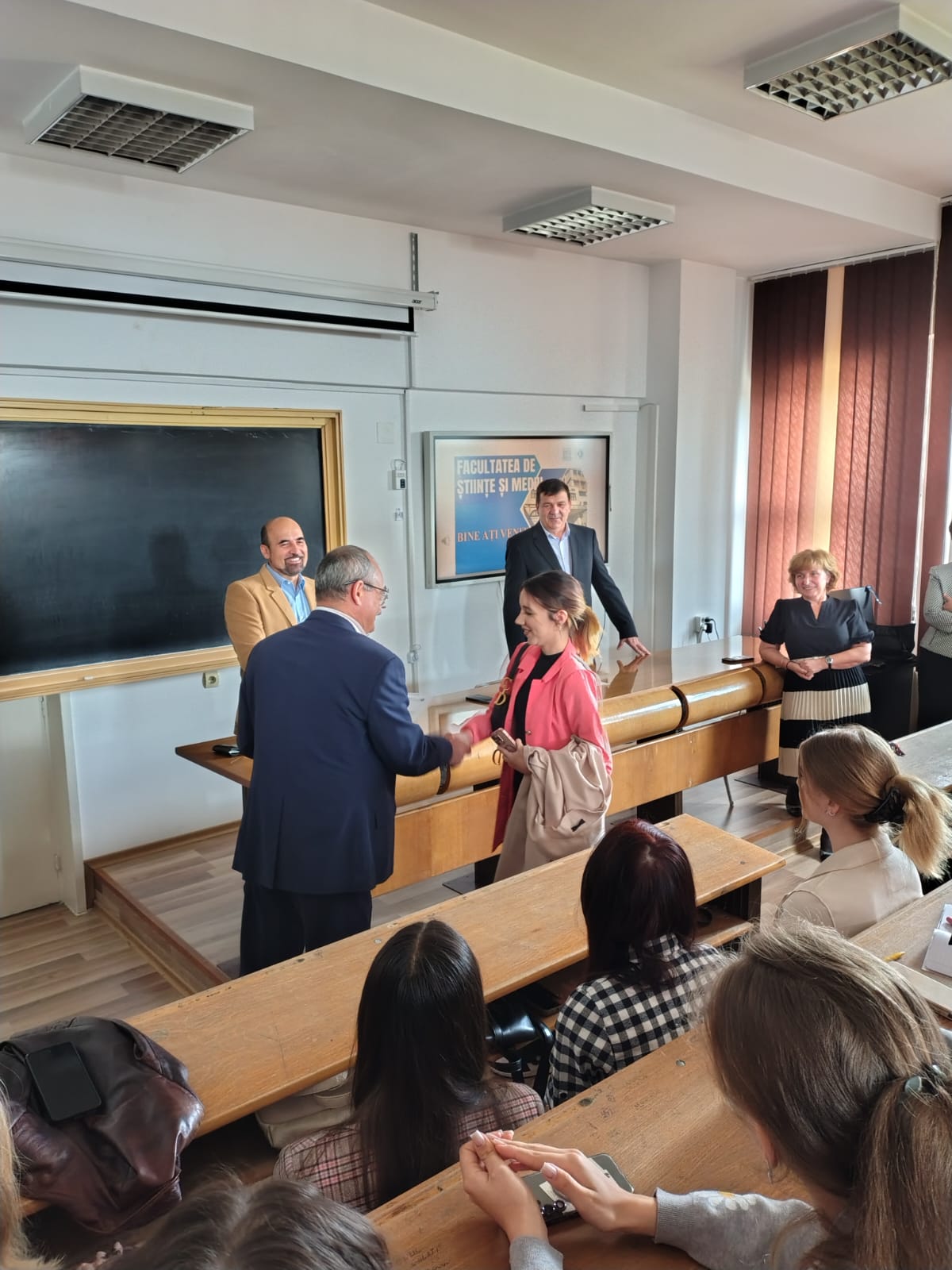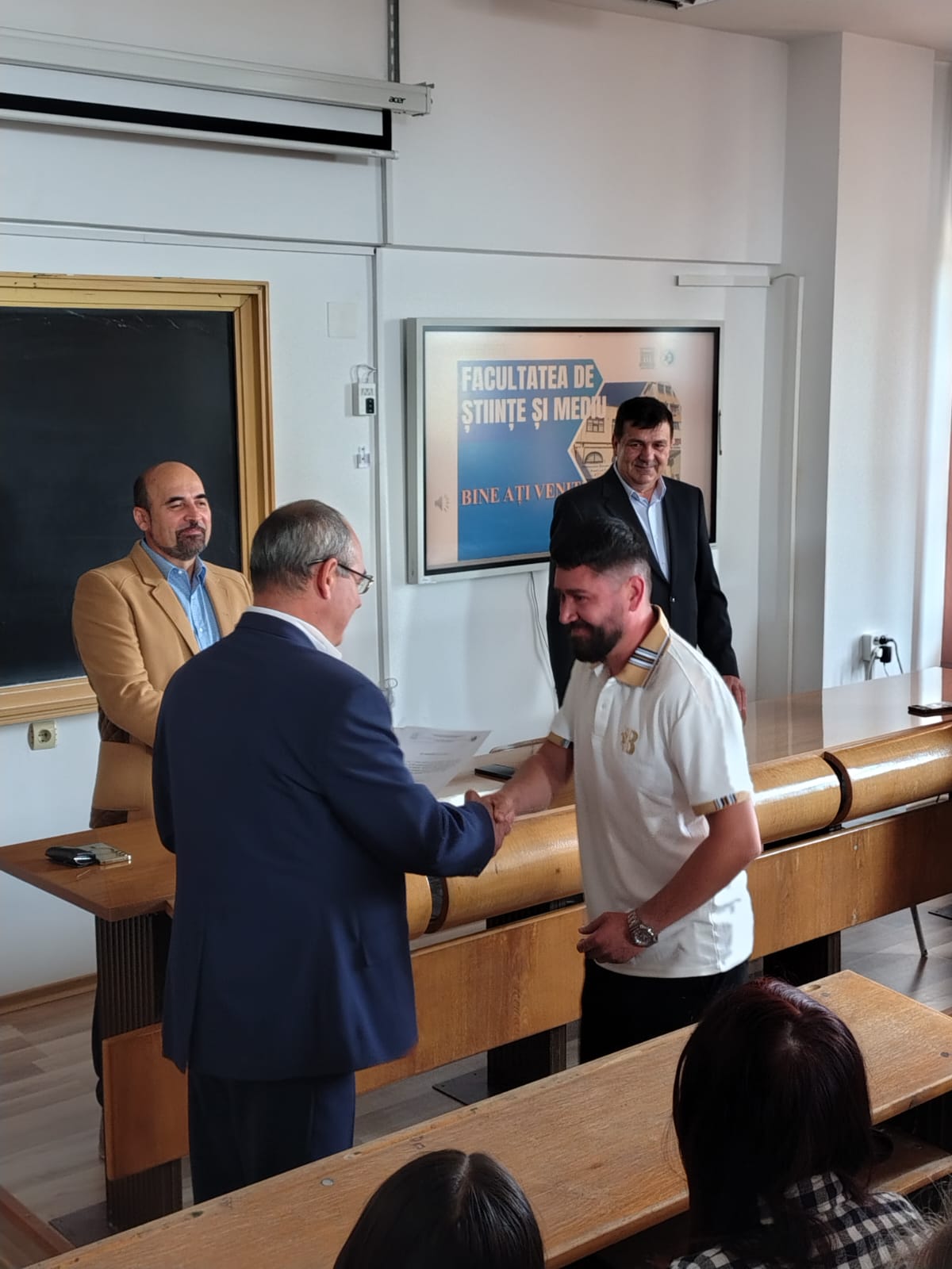 În cadrul ceremoniei, domnul decan a înmânat adeverințe de voluntariat studenților implicați în evenimentul Noaptea Cercetătorilor Europeni – ReCoNnect 2025: „Știință pentru Terra – Sustenabilitate prin responsabilizare”, organizat de Universitatea „Dunărea de Jos” din Galați în septembrie 2025.